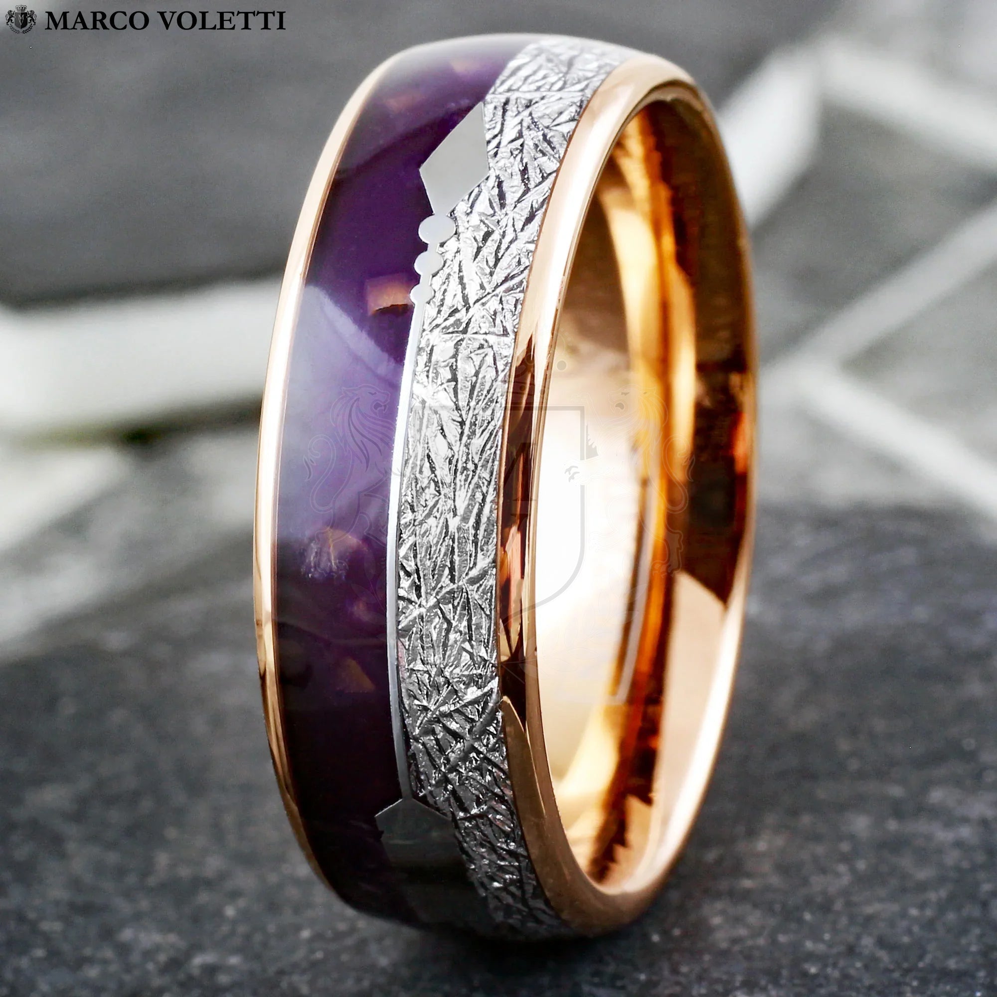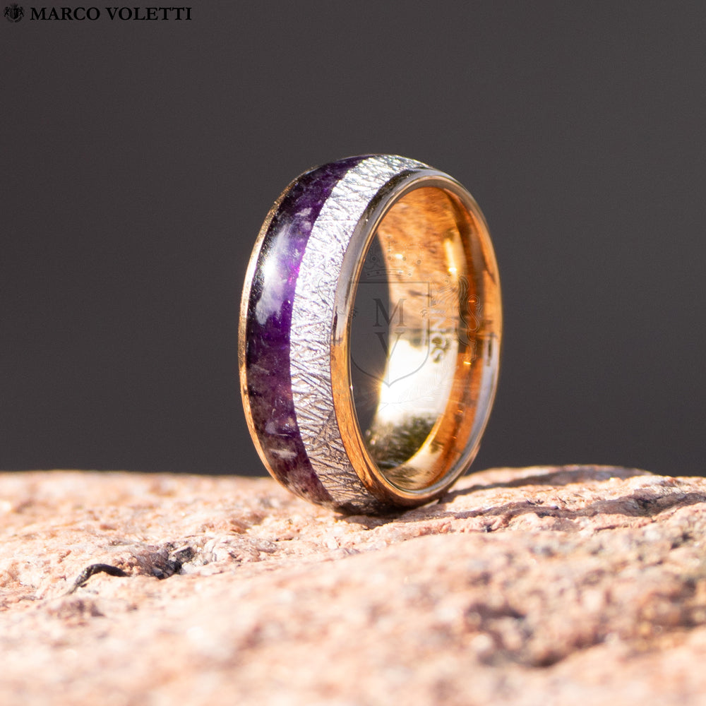 Guardian is crafted for those who protect what they hold dear, embodying the unyielding strength and vigilance of a protector. The rose gold tungsten frame offers both durability and sophistication, while the inlays of speckled purple lapis lazuli, meteorite, and silver feathered arrows symbolize watchfulness, cosmic strength, and readiness to defend. This ring represents not only the power of protection but also the deep, unbreakable bond between two people. Designed for those committed to safeguarding their connection, Guardian stands as a symbol of eternal loyalty and the unbreakable trust shared in a partnership.