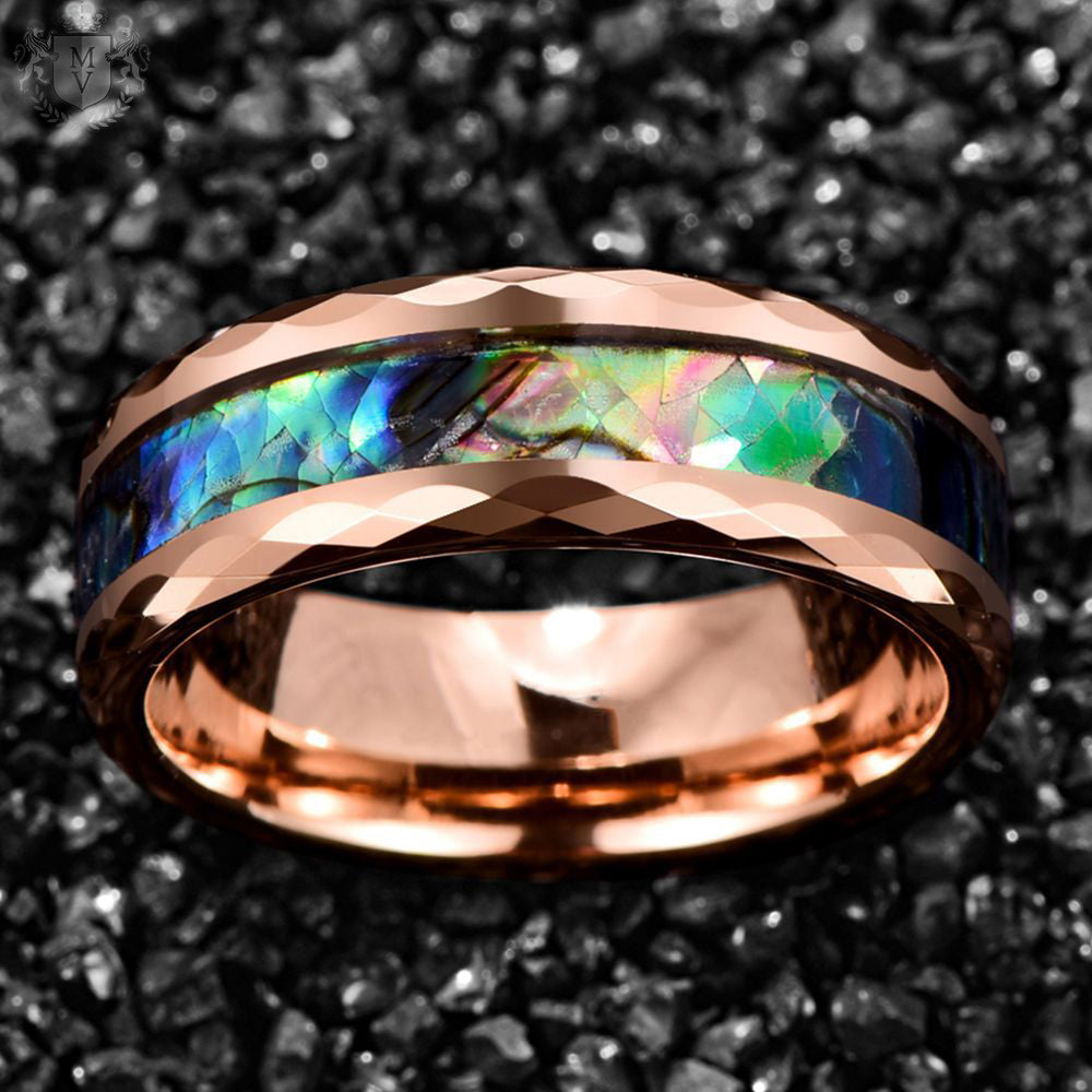 Orionis is where cosmic beauty meets refined craftsmanship. Set in a faceted rose gold-colored tungsten band, the center features abalone shell — glowing with iridescent blues, greens, and purples like the shifting sky. The precision-cut edges catch the light with every movement, adding a touch of luxury to a ring grounded in nature’s most dazzling textures. A rare balance of strength and brilliance, Orionis is made for those who carry light with them.