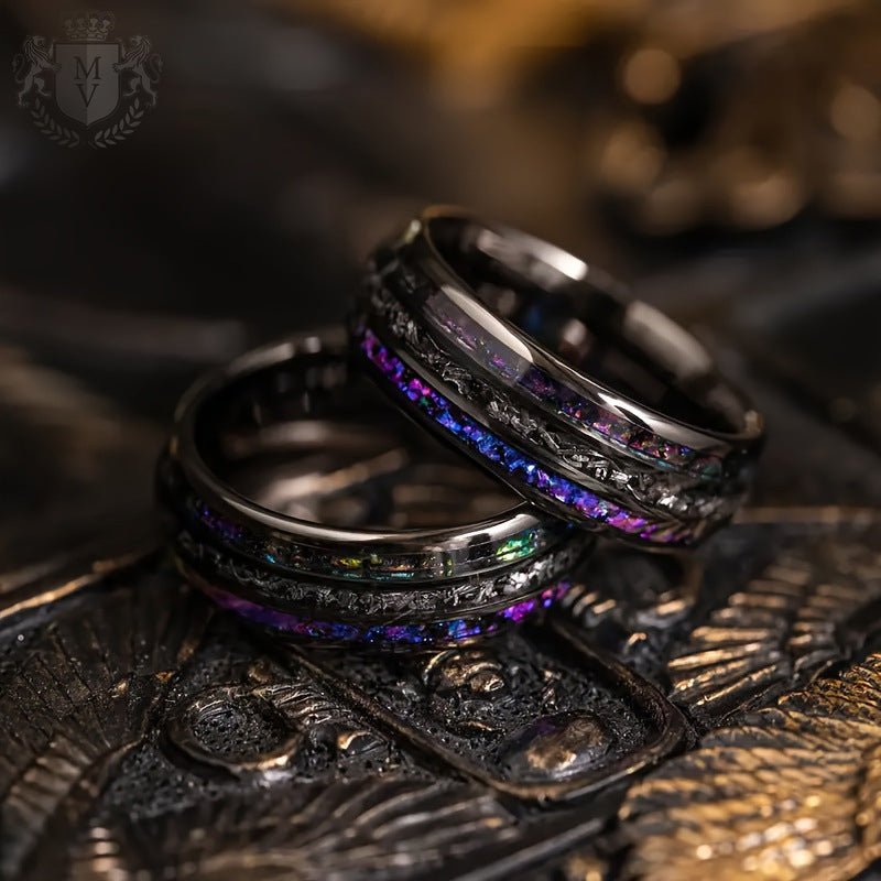 Vortex draws you in with its bold contrast and hypnotic detail. Crafted from polished tungsten carbide, this ring features a triple-channel inlay with black obsidian-like texture and vibrant crushed opal fragments in deep purples, blues, and greens. The swirling colors and layered design evoke the intensity of a cosmic vortex — powerful, rare, and endlessly captivating. For those who lead, not follow, Vortex is the ultimate expression of edge and individuality.