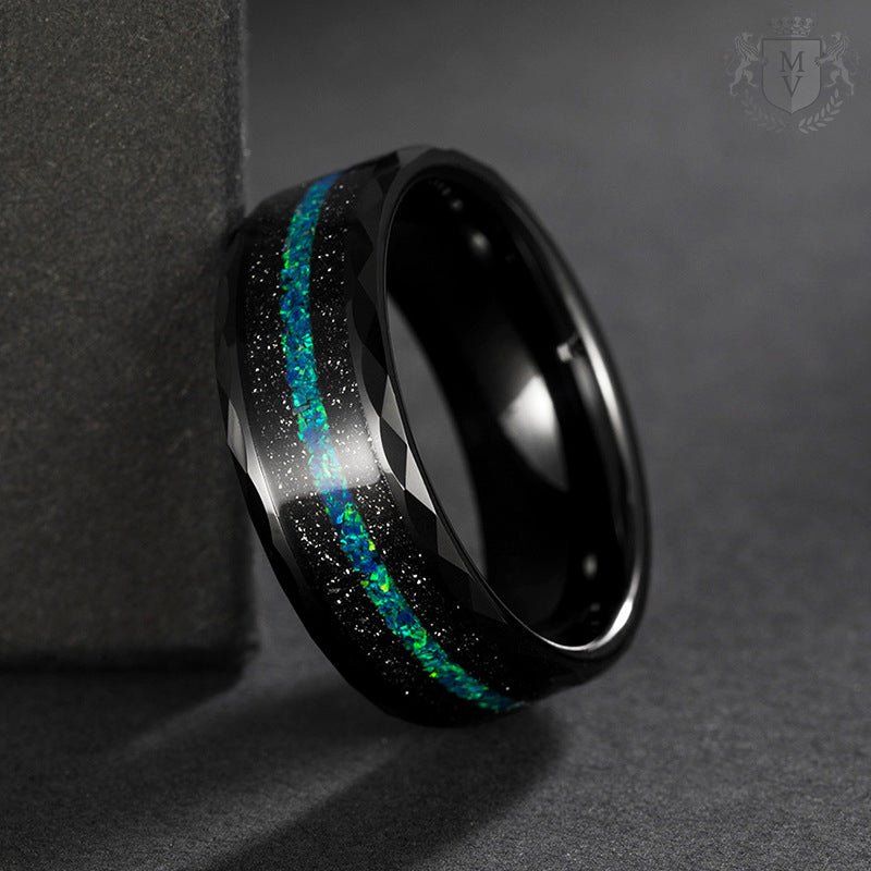 Zephyros is a ring forged for the stars. Its faceted black tungsten body catches light like distant starlight, while the central inlay evokes a galactic swirl of cosmic dust and deep-space opal shimmer. With its rich contrast and sleek 8mm silhouette, Zephyros is both bold and refined — made for those who carry the universe within.