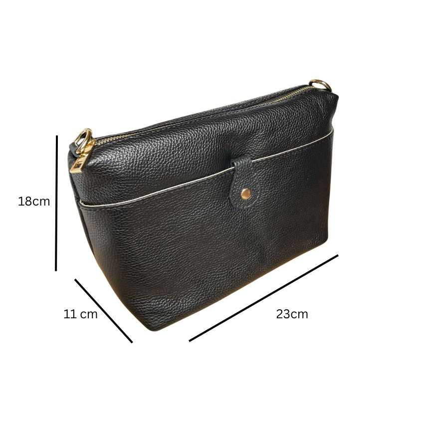 Diese Damen Leder Umhängetasche vereint Eleganz und Funktionalität. Die tief sitzende Fronttasche mit Knopfverschluss bietet Platz für Handy oder Schlüssel, während das Hauptfach mit Reißverschluss Ihre persönlichen Dinge sicher aufbewahrt. Dank ihres zeitlosen Designs ist sie der perfekte Begleiter für Alltag, Stadt und Reise.
