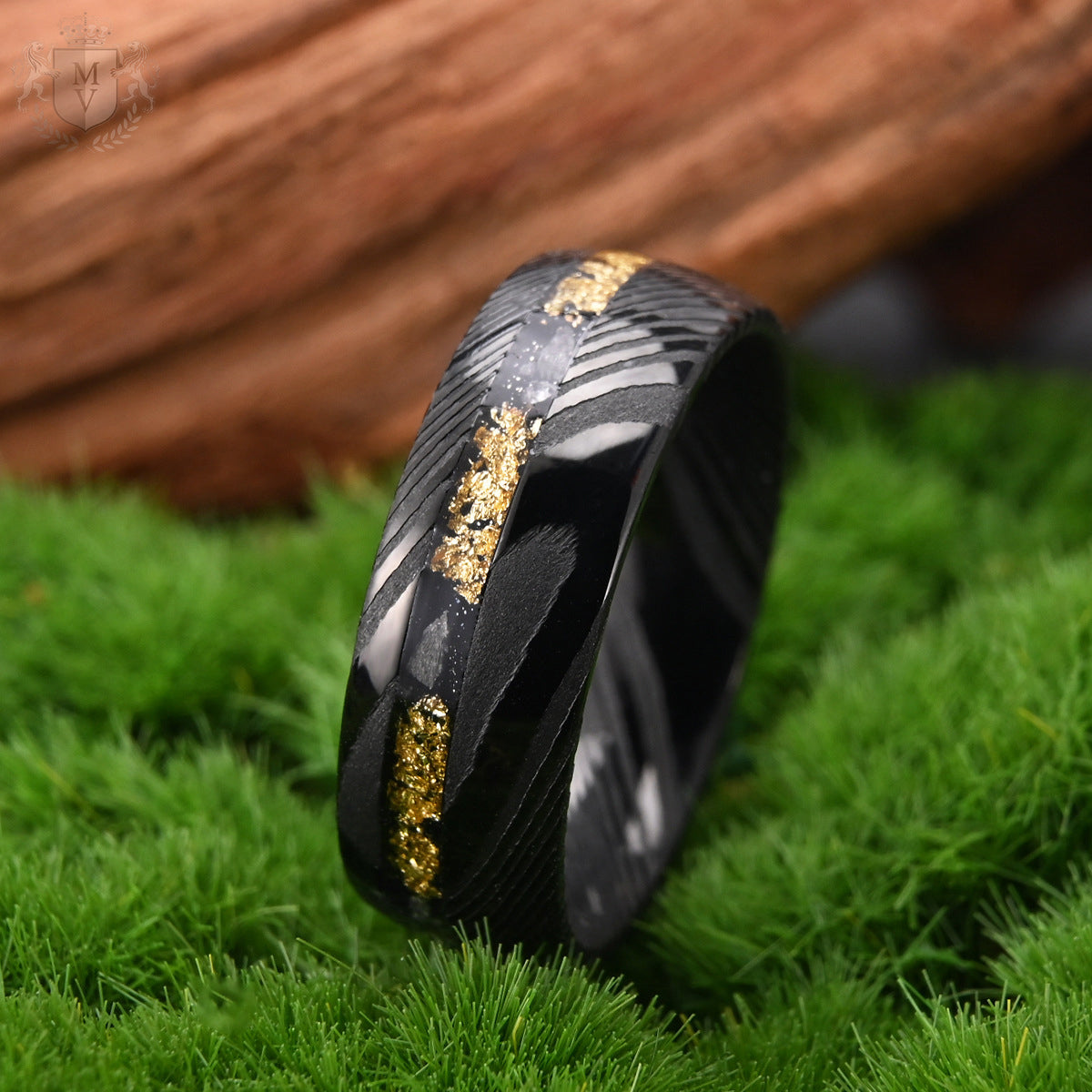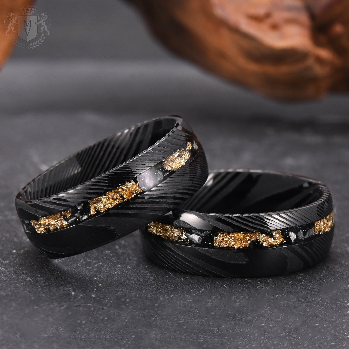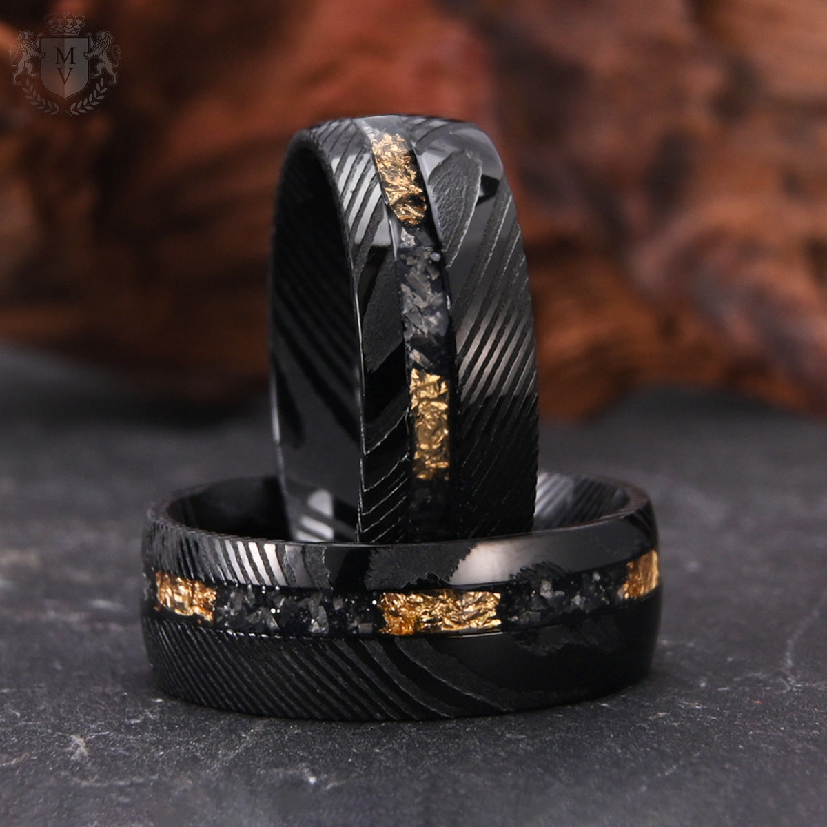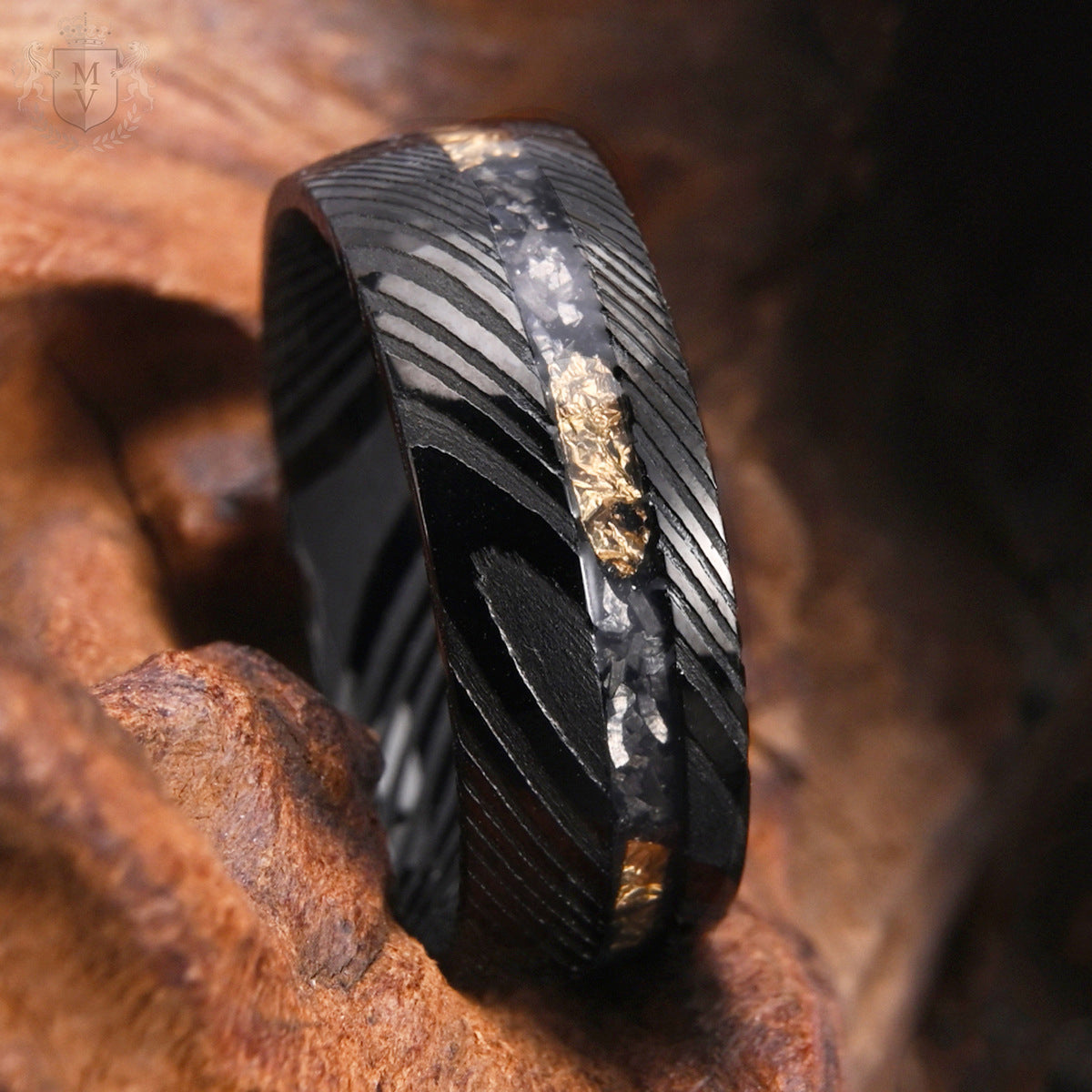 Varekai is made for those who walk their own path. The Damascus steel exterior, plated in deep black, creates a hypnotic flow of ridges and raw texture. A jagged inlay of meteorite-like fragments and shimmering 18K gold foil carves through the center — a reminder that chaos often hides brilliance. It’s a ring that feels untamed but purposeful, crafted for men who don’t just follow stories — they write them.