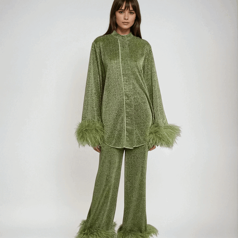 Luxe Feather Accents: I dettagli in piuma sui polsini e sull'orlo aggiungono un tocco audace e glamour a questo completo. Le morbide e leggere piume creano un contrasto unico con la vestibilità strutturata ma rilassata, offrendo comfort e un fascino alla moda. Perfetto per chi ama distinguersi con fascino.