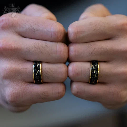 Alerion captures the elegance of design with a cosmic edge. Set against a deep black backdrop, delicate strands of gold glimmer like constellations, drawing the eye without demanding it. The polished 18K gold plating adds warmth and balance, creating a ring that speaks to those who lead with subtle confidence and precise intention. It's a piece that pairs refinement with a touch of the extraordinary — made to stand out quietly.