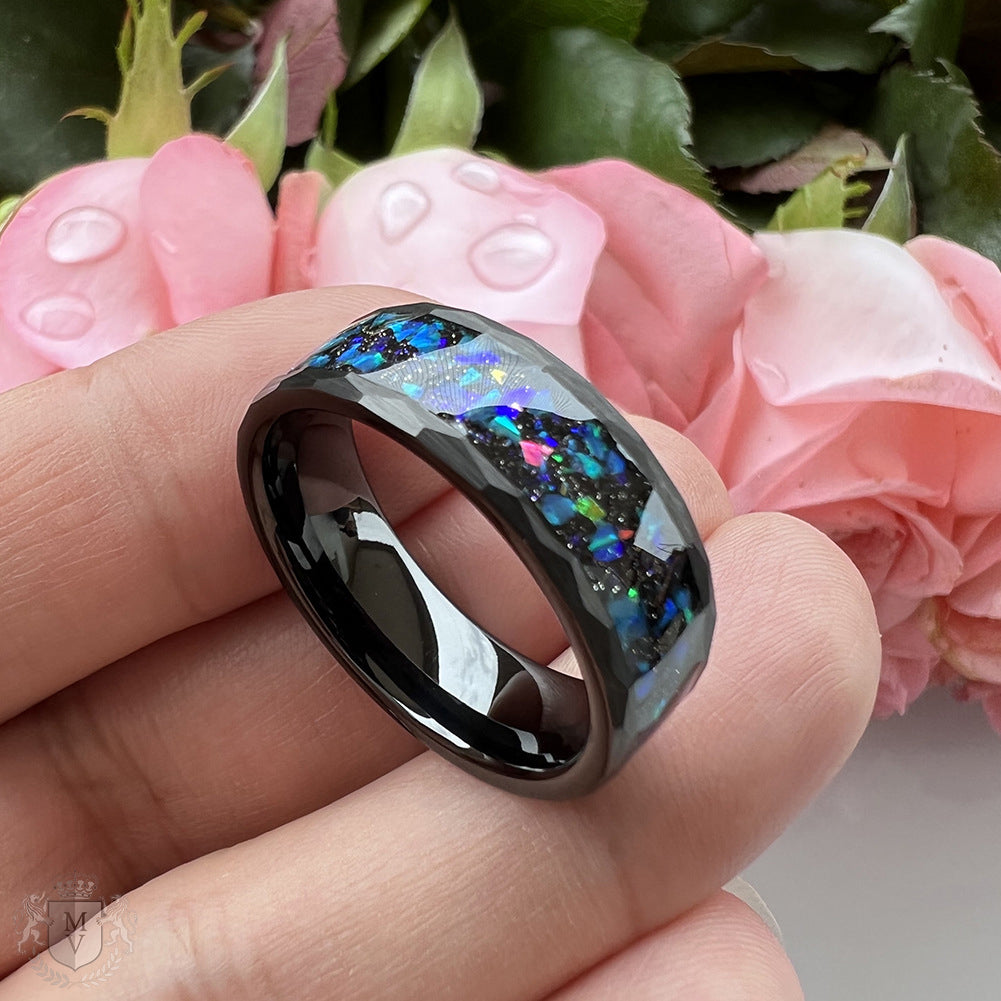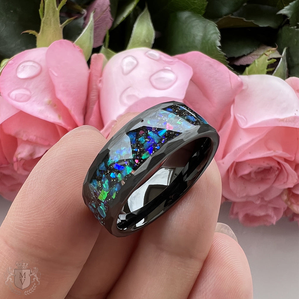Astralis captures the wonder of the cosmos with every flicker of color. Forged from faceted black tungsten carbide, this ring features a mesmerizing crushed opal inlay that glows like a distant galaxy. Greens, blues, and purples shift with the light, creating a sense of movement and depth. Sleek, cosmic, and undeniably bold — Astralis is made for those who carry the universe within.