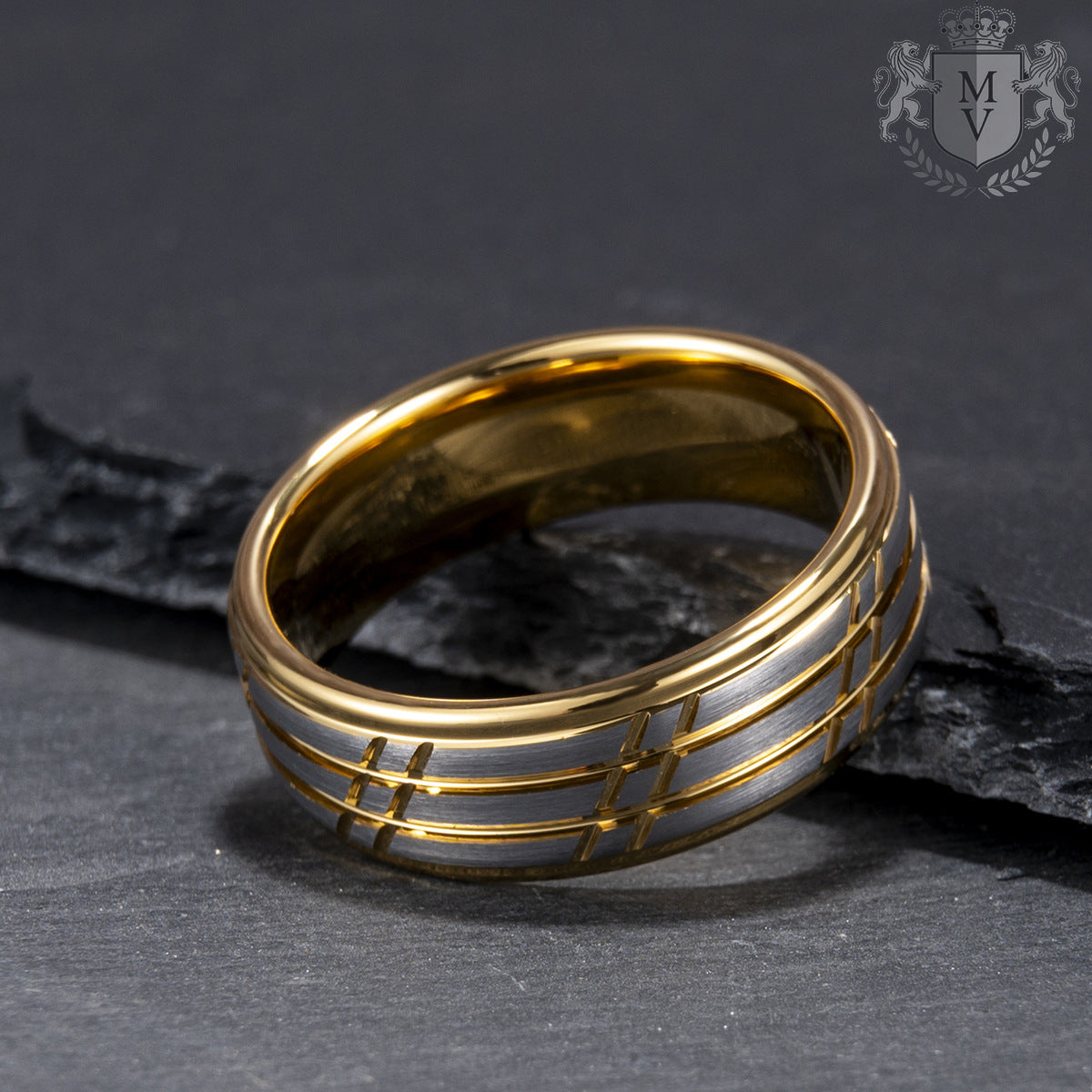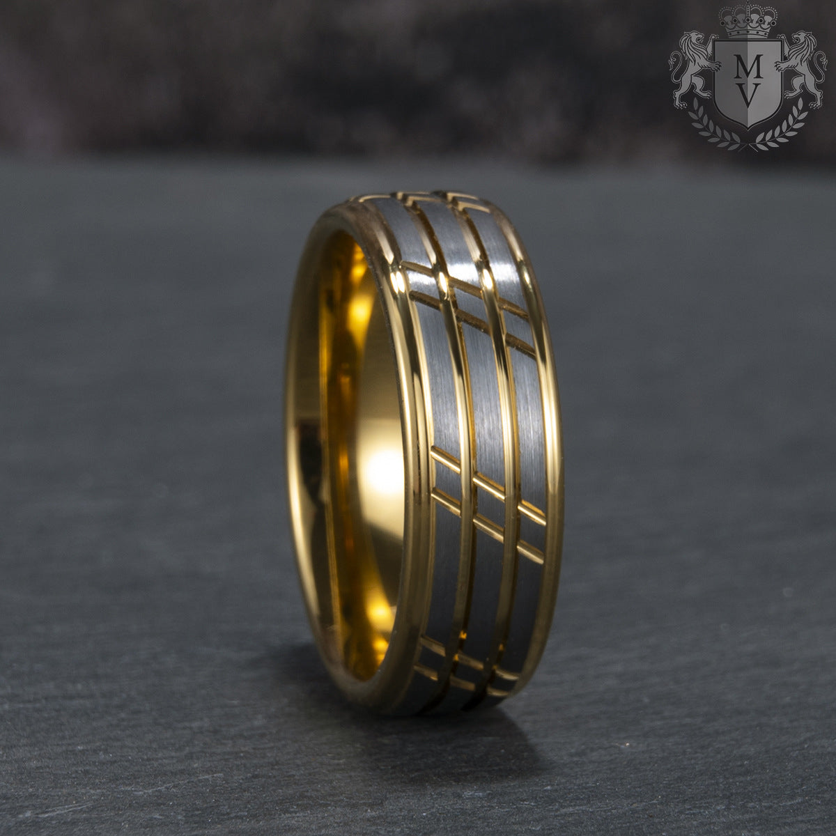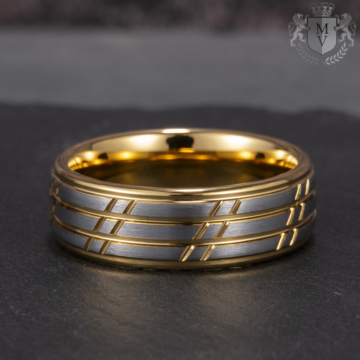 Bravado is a ring that commands attention with its bold contrast and refined craftsmanship. The fusion of brushed silver tungsten carbide with intricate gold-accented grooves creates a striking balance between strength and sophistication. The 18K gold-plated interior adds a touch of luxury, making this ring the perfect symbol of confidence and resilience. Whether worn as a statement piece or a wedding band, Bravado represents unwavering style and character.