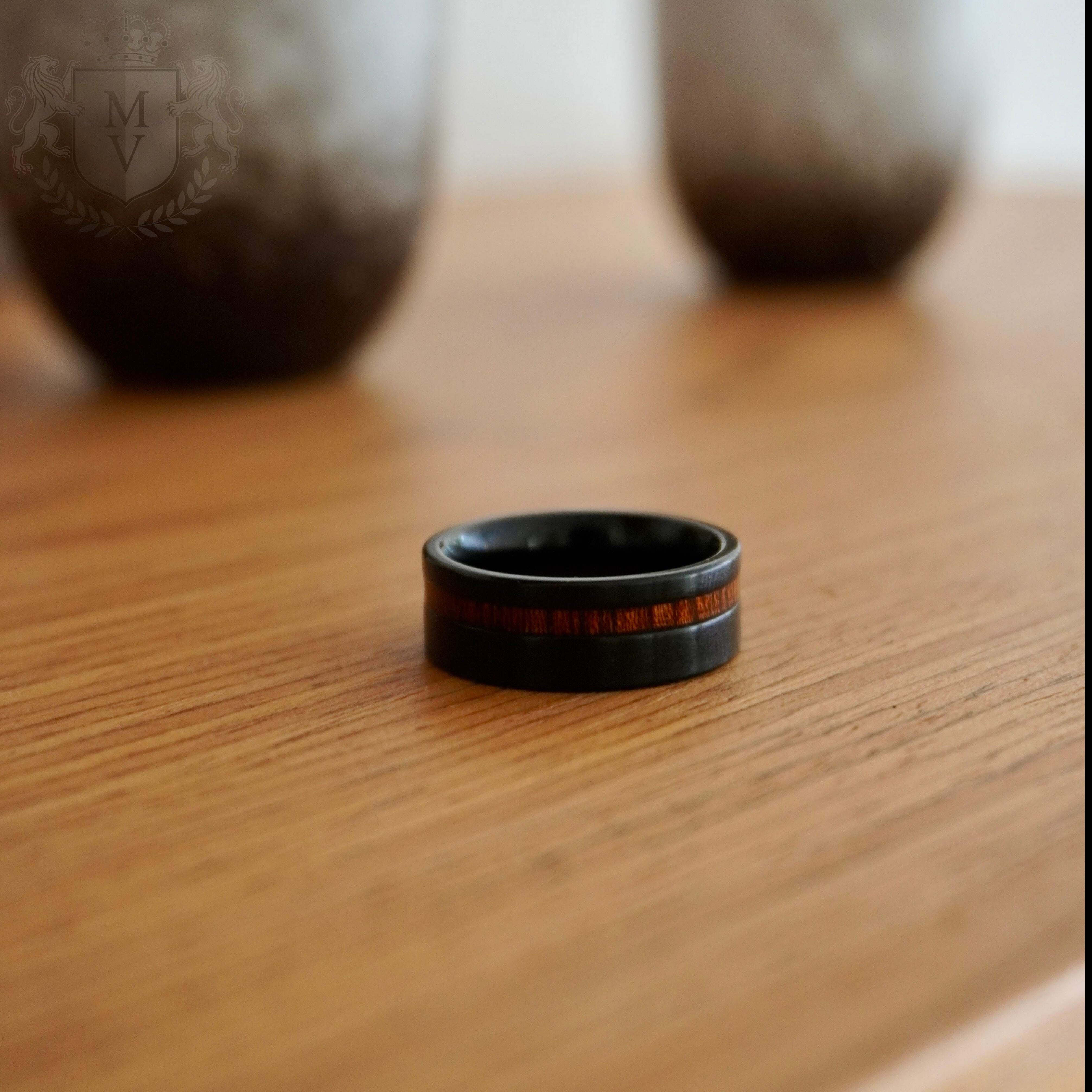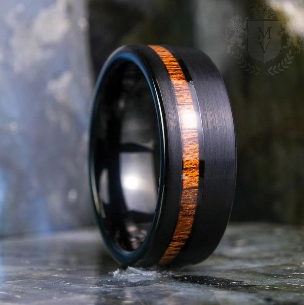 Draven is a bold fusion of modern strength and natural elegance, designed for those who embody confidence and resilience. The polished tungsten steel exterior exudes durability and sophistication, while the rich acacia wood inlay adds an organic, timeless touch. Built to withstand the test of time, Draven maintains its brilliance and depth through every journey. A statement of refinement and bold character, this ring is crafted for those who forge their own path.