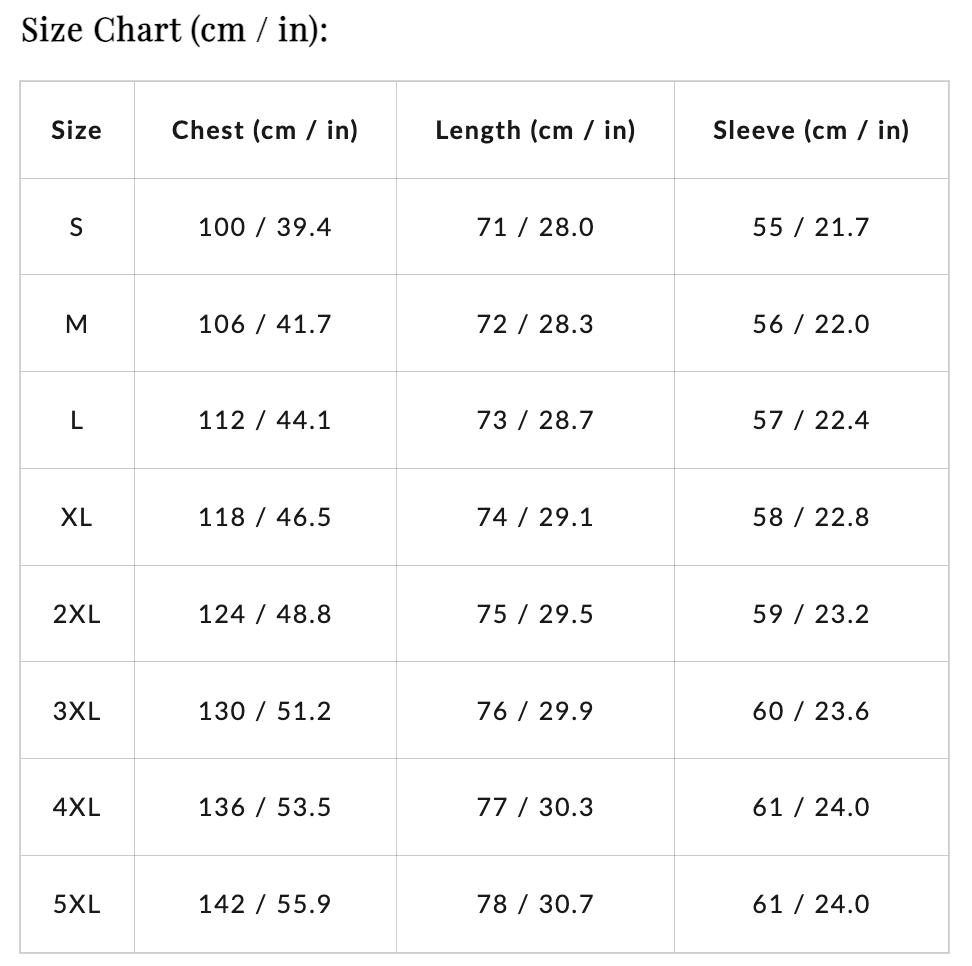 | Size | Chest (cm / in) | Length (cm / in) | Sleeve (cm / in) |