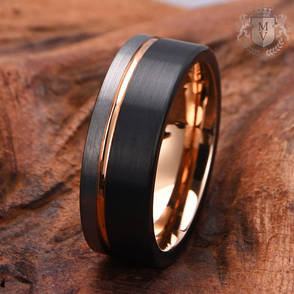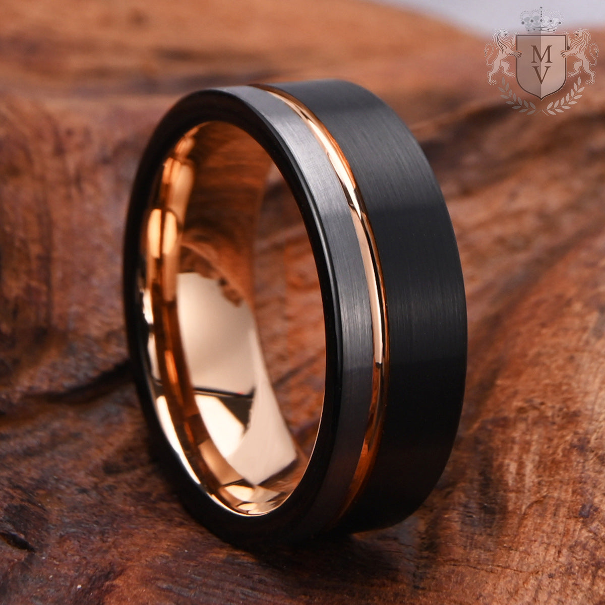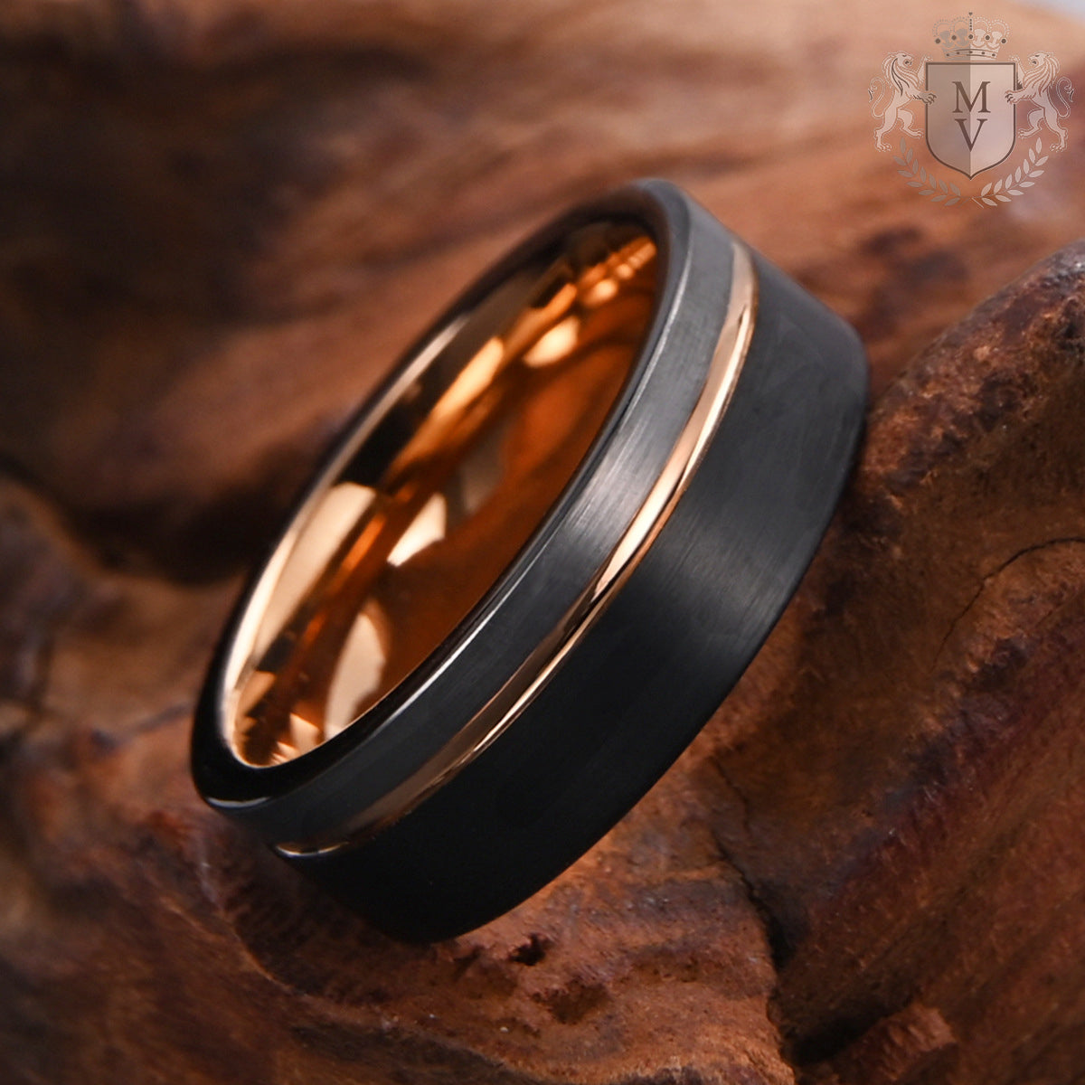 Imperium exudes power with its bold fusion of black, silver, and rose gold tones. The brushed black tungsten exterior is accented by a sleek silver inlay and a refined rose gold groove, creating a striking, contemporary aesthetic. The polished rose gold interior adds a touch of warmth and elegance, making this ring a perfect balance of strength and sophistication. Designed for those who lead with confidence, Imperium is a statement of resilience and style.