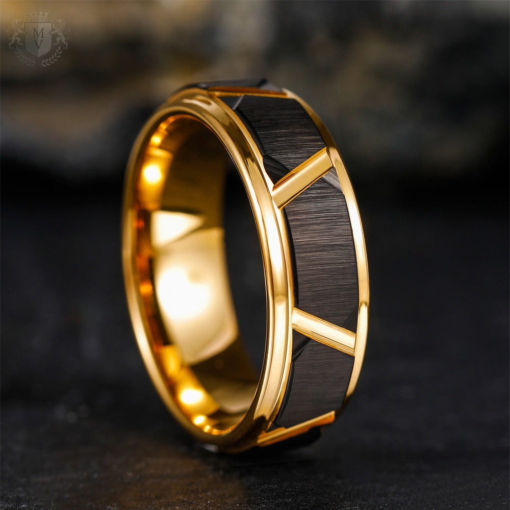 Magnar is a symbol of quiet dominance — a ring that doesn’t beg for attention, but commands it. Crafted from black brushed tungsten and elevated with sharp, angular grooves plated in 24k gold, this piece blends bold contrast with flawless geometry. Inspired by strength, leadership, and timeless form, Magnar is made for those who lead with presence, not volume.