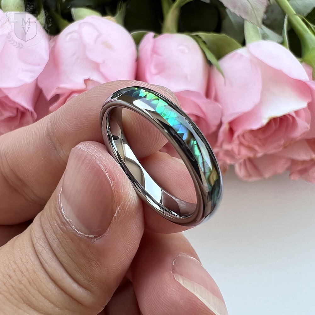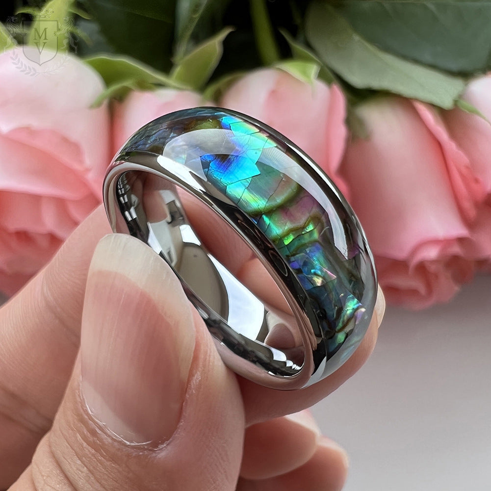 Materials: Tungsten carbide, natural abalone shell inlay, polished silver finish.