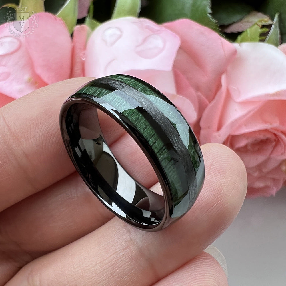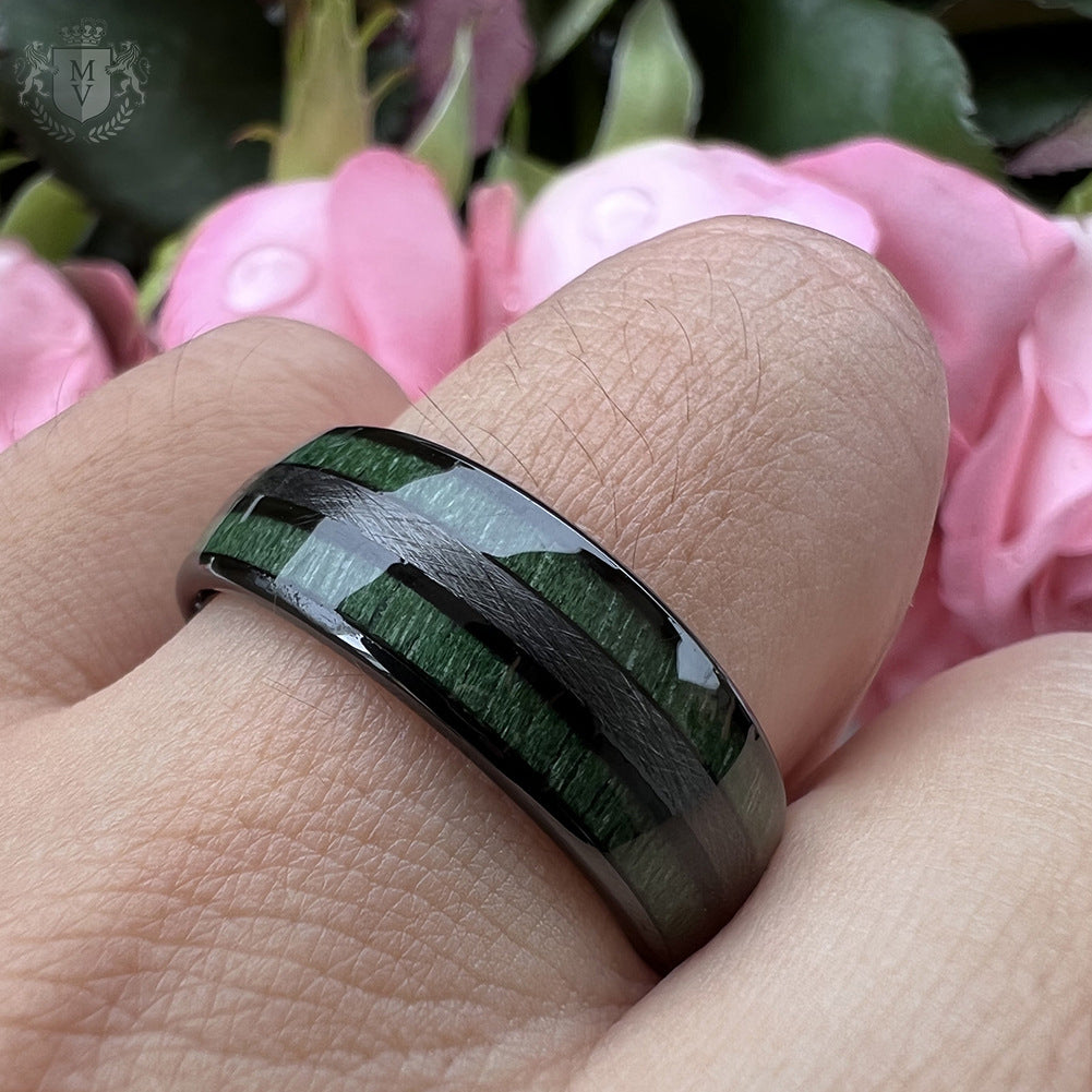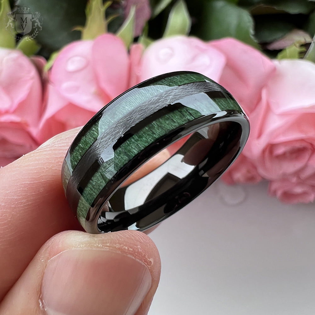 Materials: Tungsten carbide, green wood inlay.