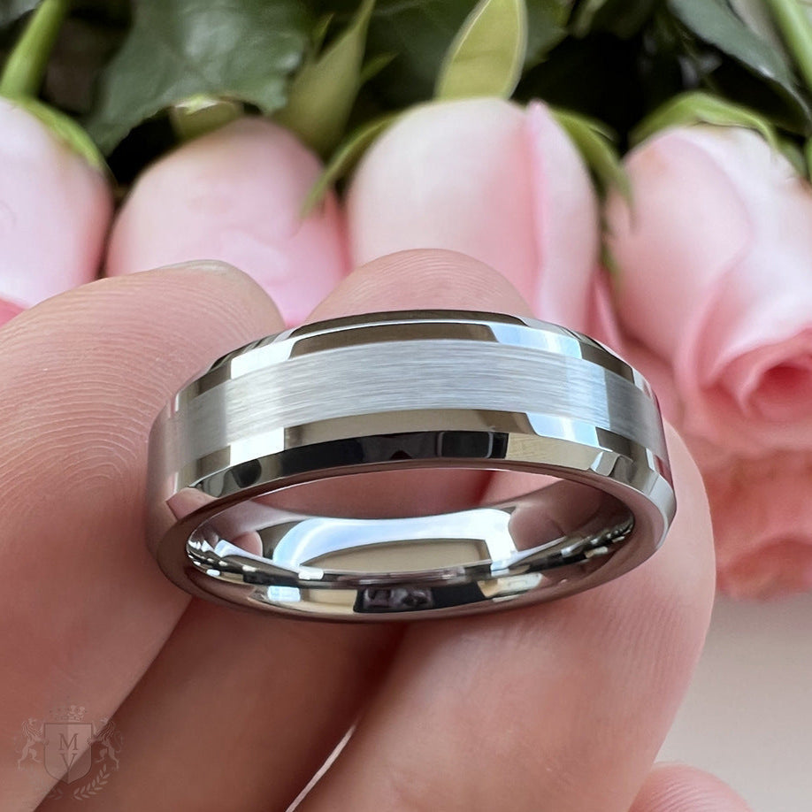 Alaric is the perfect expression of refined masculinity. Made from high-grade tungsten carbide, this ring features a satin-brushed center framed by polished beveled edges, creating a sharp contrast that’s both modern and timeless. Its solid weight and clean lines make it ideal for those who appreciate minimalist design and enduring strength. A ring that quietly commands attention — whether worn as a symbol of love, loyalty, or personal style.