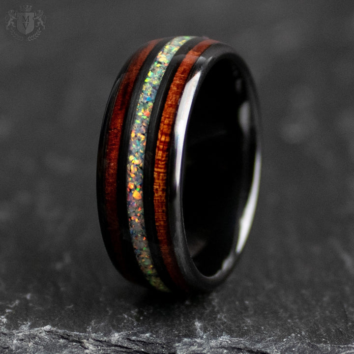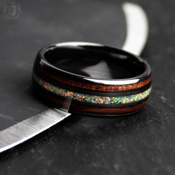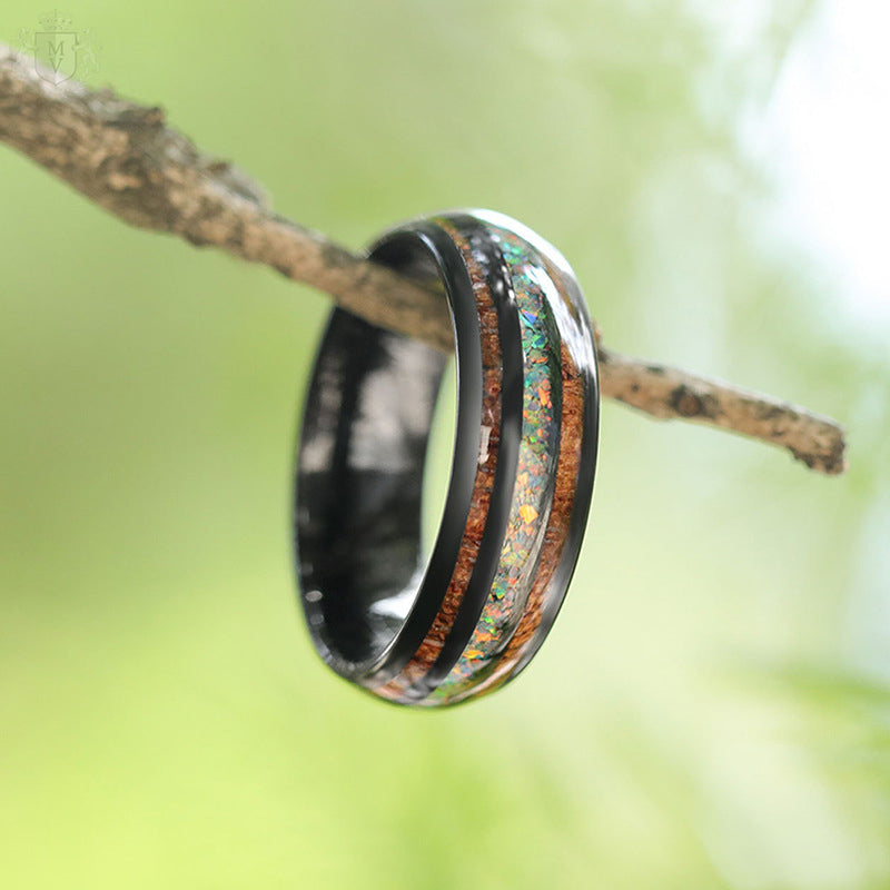 Materials: Black tungsten carbide, wood inlays, crushed opal center.