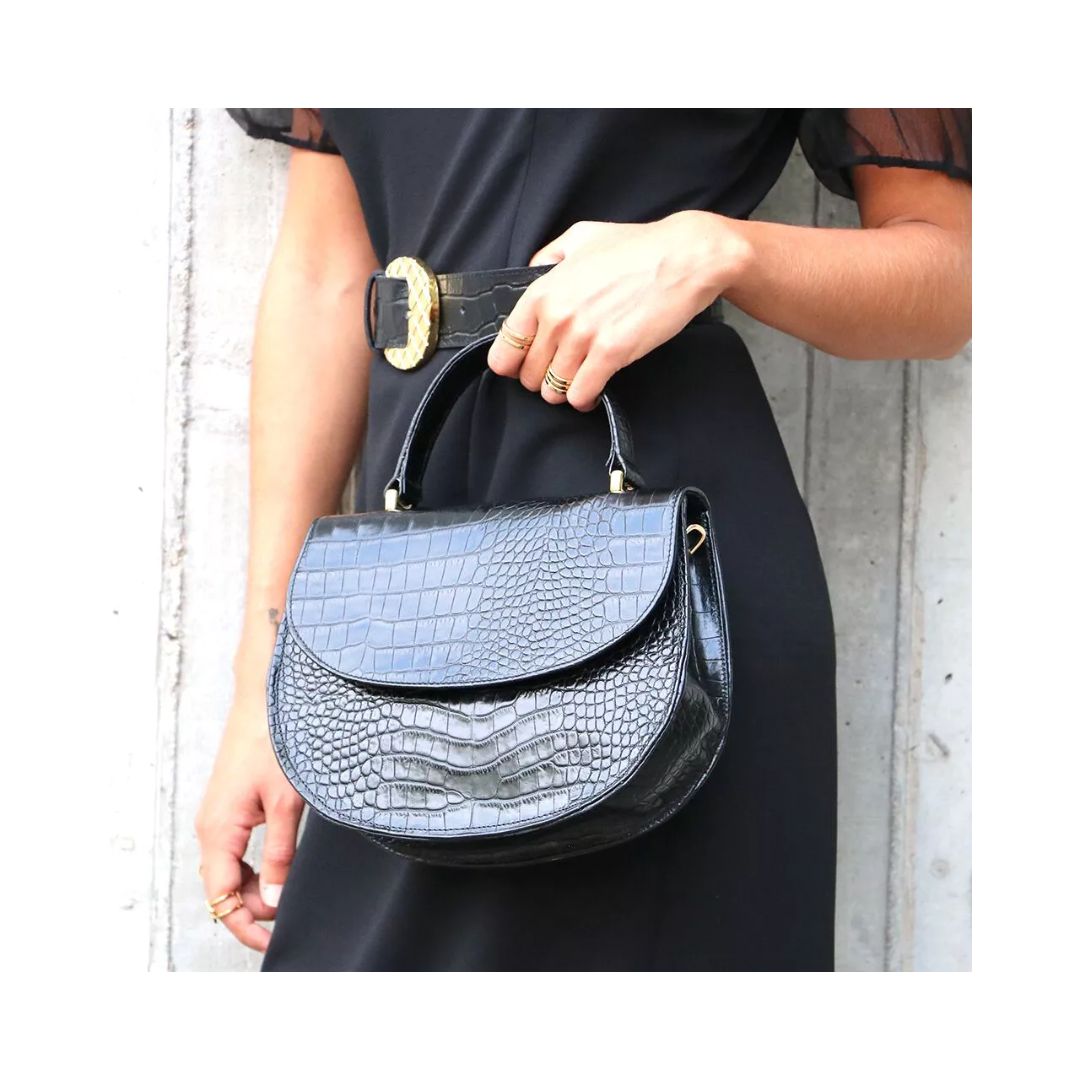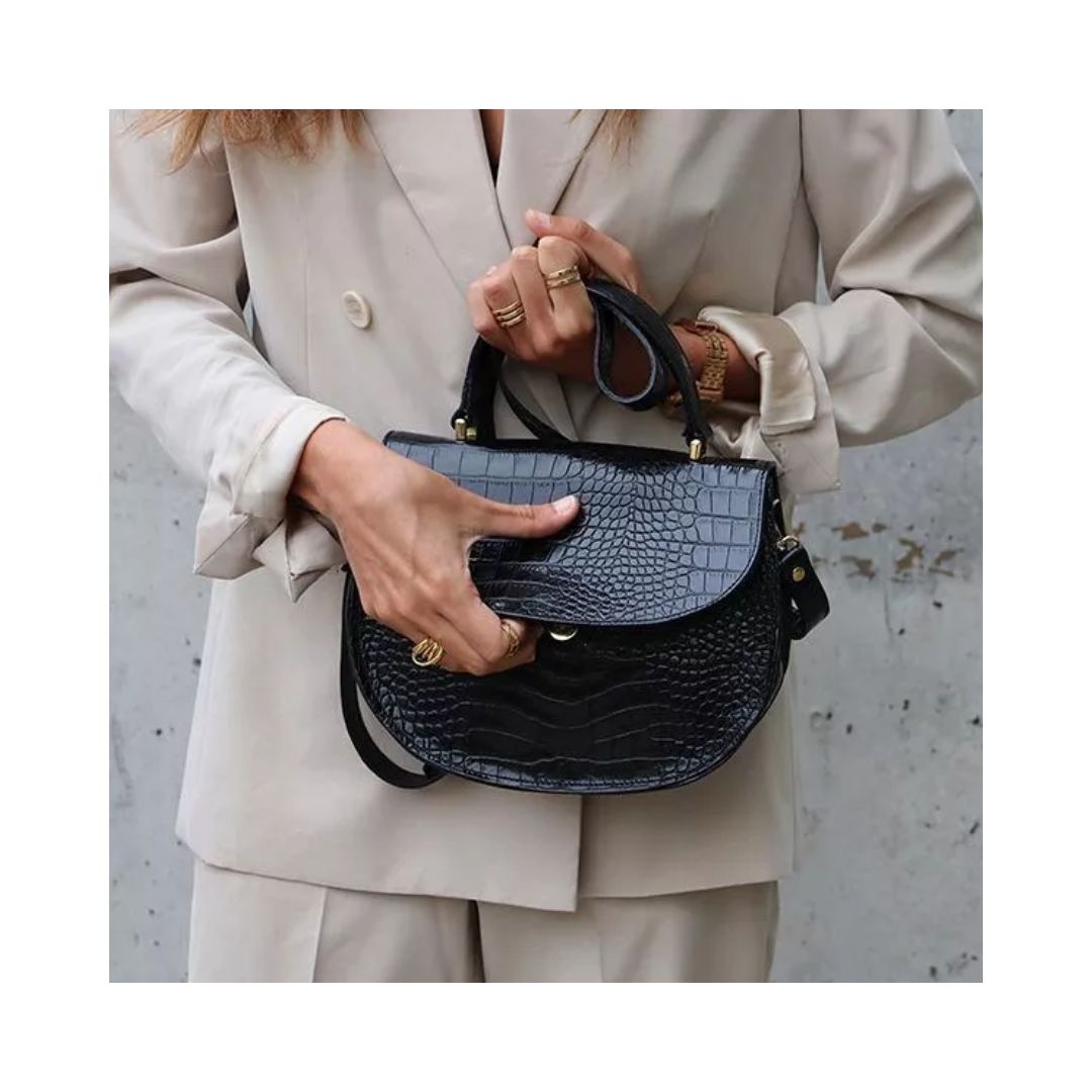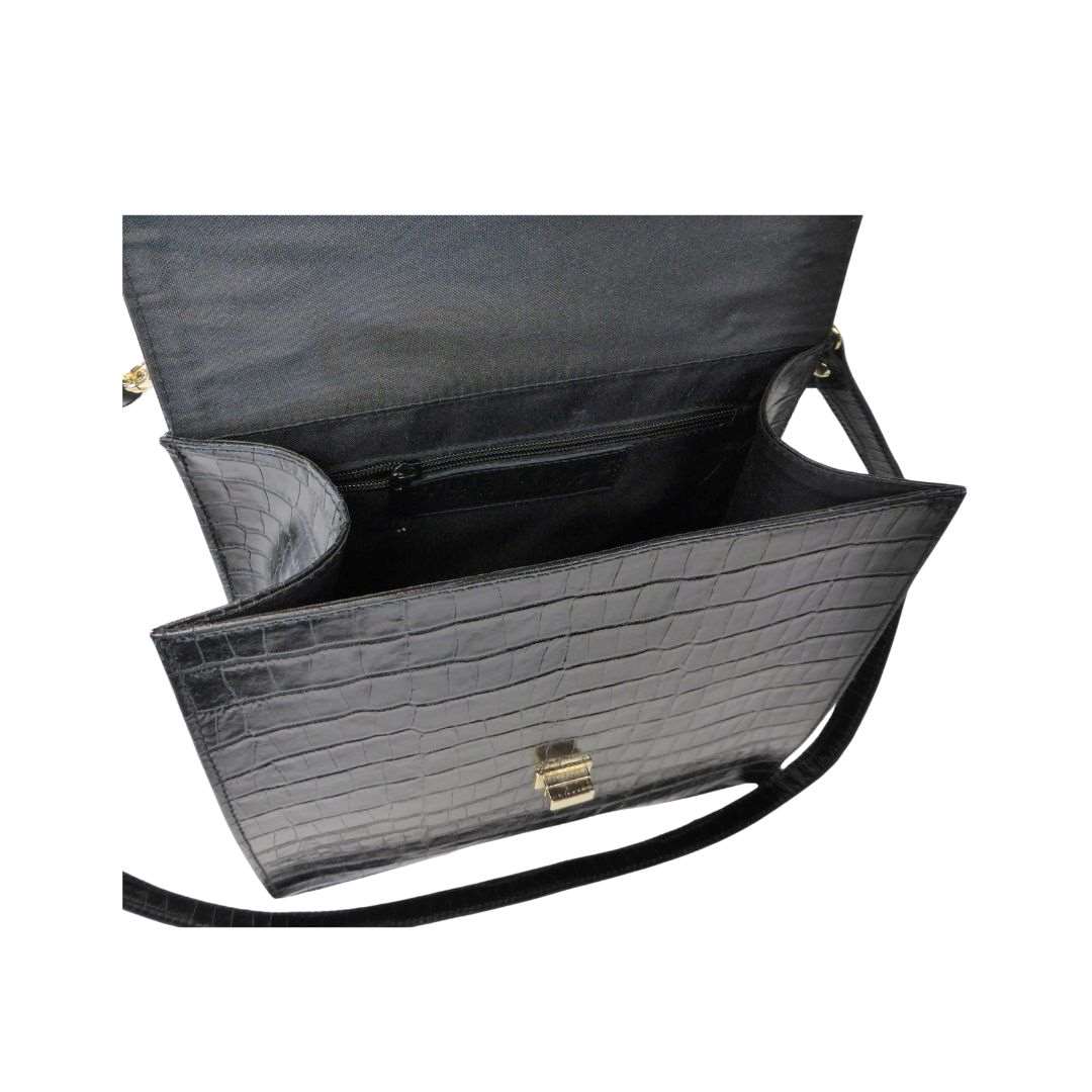 Schwarze Damen Leder Handtasche mit Schlangenprägung